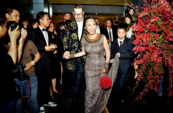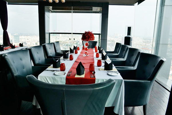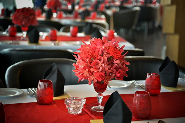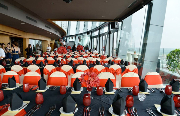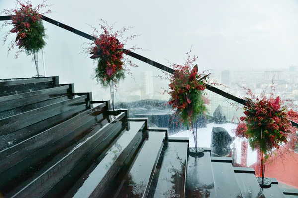 Bữa tiệc diễn ra ở một quán bar trên tầng 26. Ngay từ cầu thang dẫn lên sảnh tiệc, những cụm hoa lớn với tông màu đỏ rực đã thu hút sự chú ý của khách mời. Đặc biệt, những bậc thang màu đen bóng tạo nét tương phản độc đáo với hoa và đất trời.