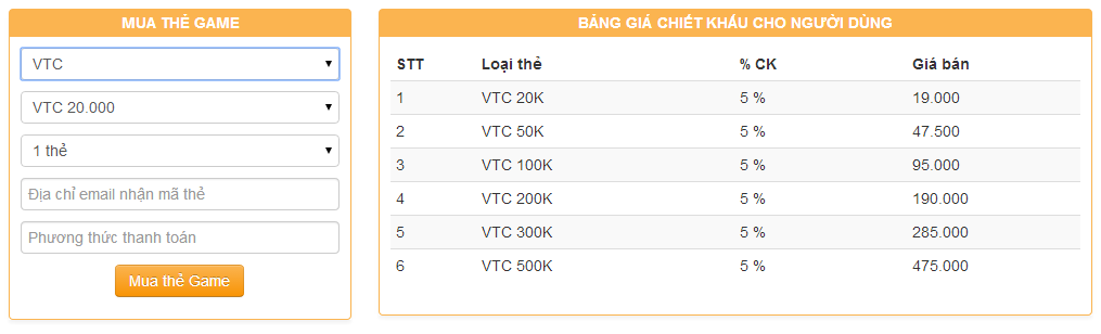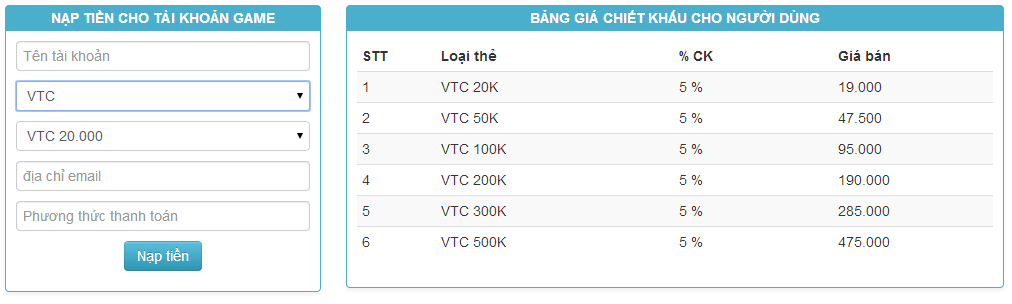 Nạp thẻ VTC Game trên thecao.net bạn sẽ có chiết khấu , mua thẻ rẻ hơn những nơi khác , nap vcoin vtc bao nhiêu cũng được tùy nhu cầu của bạn , hình thức thanh toán nhanh - gọn - nhẹ bằng thẻ ATM của các ngân hàng nội địa tại Việt Nam , hình thức mua the vtc online áp dụng được cả ở nước ngoài , thanh toán bằng thẻ quốc tế như Mastercard hoặc Visa đều ok . Giao diện rất dễ sử dụng và đơn giản đối với mọi đối tượng và việc mua card vtc không còn khó khăn nữa