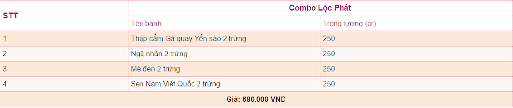 " Lộc Phát ", một cái tên thật tròn đầy, chắc hẳn ngay ở cái tên ấy đã gợi lên được ý nghĩa của combo bánh trung thu Brodard Lộc Phát năm nay, một món quà ý nghĩa dành tặng người thân với ý nghĩa rước lộc may đến nhà Thành phần combo bánh trung thu Brodard Lộc Phát : - Bánh thập cẩm Gà quay Yến sào 2 trứng : với hương vị thơm ngon, giòn tan của gà quay kết hợp cùng Yến sào cao cấp, một trong những loại thực phẩm nằm trong bát bửu dành làm cống phẩm cho vua chúa - Bánh ngũ nhân 2 trứng : được làm từ 5 loại ngũ hạt với đầy đủ các hương vị ngọt, bùi khác nhau tạo cho người dùng một vị giác mới khi vừa chạm môi vào chiếc bánh tròn với lớp nhân và võ bánh được chế biến rất công phu - Bánh Mè đen 2 trứng : là một trong những loại bánh trung thu Brodard rất được ưa chuộng nhờ vị ngọt và bùi của nhân mè đen kết hợp hài hòa với vị mặn vừa phải của trứng vịt muối giúp cho người ăn không có cảm giác ngán. Ngoài ra, mè đen cũng là một loạt thuốc đông y có rất nhiều tính năng giúp người dùng bổ thân dưỡng huyết, có lợi cho sức khỏe - Bánh Sen nam Việt Quốc 2 trứng : là sự kết hợp hài hòa giữa vị ngọt bùi của hạt sen và hương thơm nồng nàn của trái nam việt quốc, là loại quả rất được yêu thích toàn thế giới không chỉ chúng ngon mà còn bởi chúng cung cấp nhiều lợi ích, một phương thuốc vàng của sức khỏe ![]() Xem thêm bảng giá bánh trung thu Brodard năm 2015